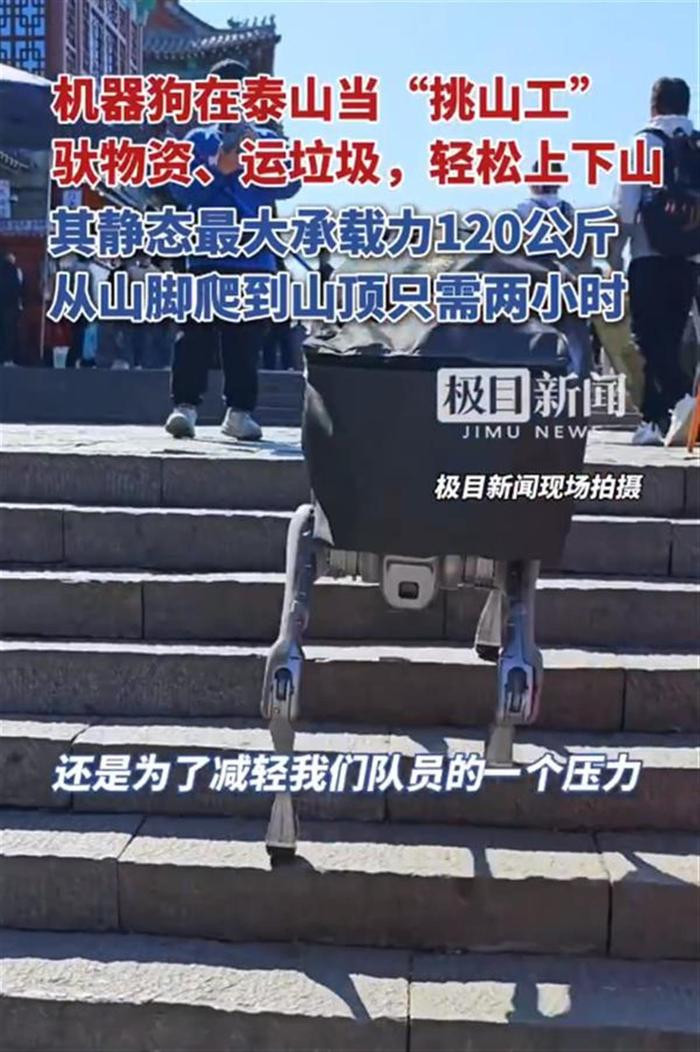 机器人帮助游客们轻松“搞定”泰山,登山者哪怕对体力没有信心,也能鼓足勇气,去看看更高处的风景。机器狗在陡峭山路上健步如飞,续航4至6小时不间断工作,运输物资,清运垃圾,给游客们带来便利,也守护了宝贵的自然环境。